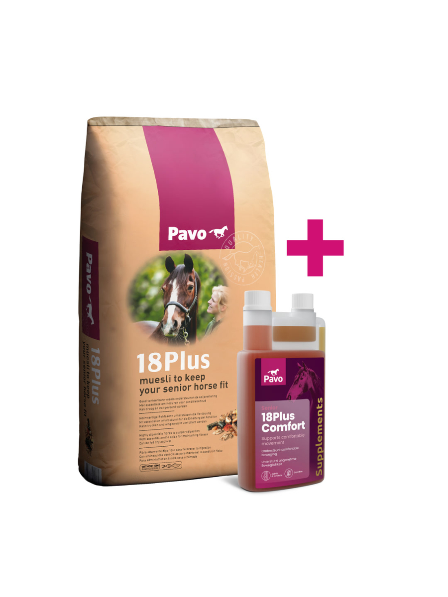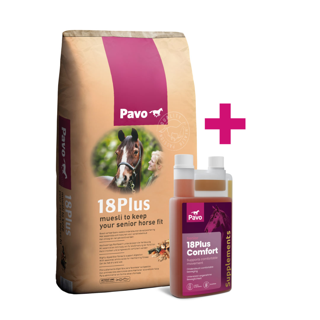 Met de juiste voeding kun je jouw oudere paard beschermen bij verlies van vitaliteit. Pavo 18+ is speciaal afgestemd op de behoeften van oudere paarden. Pavo 18+ Comfort geeft ondersteuning aan gewrichten. De ideale combinatie voor een vitale senior.